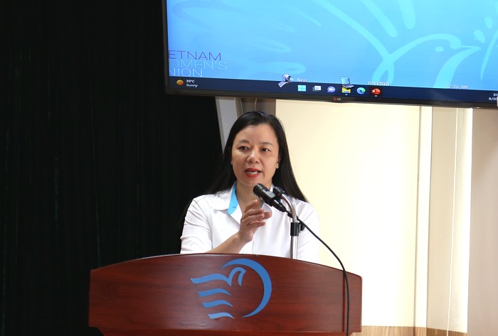 Đồng chí Nguyễn Thị Thu Hiền, Chánh Văn phòng TW Hội tham luận tại hội nghị