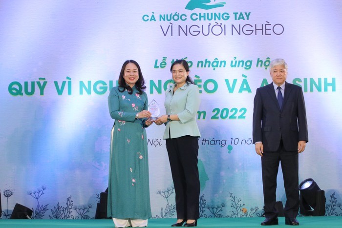 Phó Chủ tịch nước Võ Thị Ánh Xuân trao biểu trưng đơn vị ủng hộ Quỹ "Vì người nghèo" và các chương trình an sinh, xã hội năm 2022 cho Phó Chủ tịch Thường trực Hội LHPN Việt Nam Đỗ Thị Thu Thảo. Ảnh Ng. Thắng