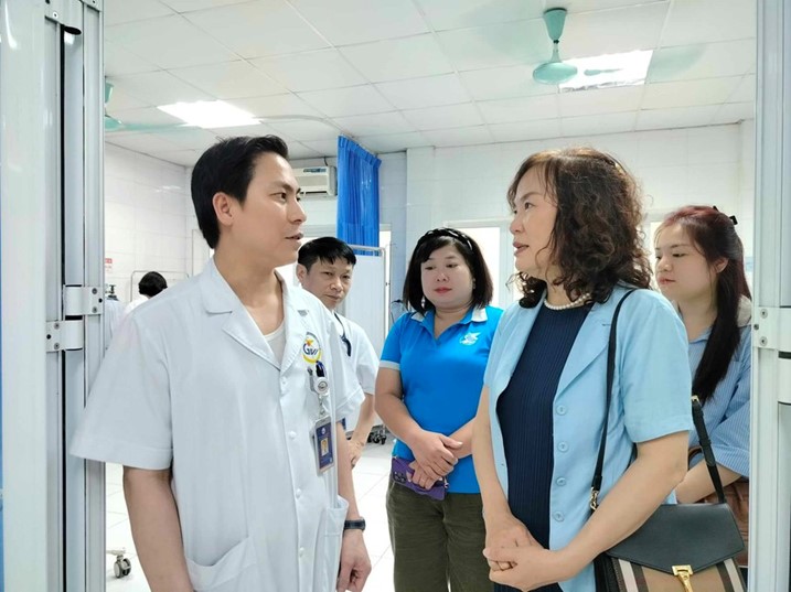 Bà Trương Thị Thu Thủy, Trưởng Ban Gia đình Xã hội, TW Hội LHPN Việt Nam trao đổi với TS.BS Bùi Sỹ Tuấn Anh, Giám đốc Bệnh viện giao thông Vận tải về tình hình sức khỏe các bệnh nhân