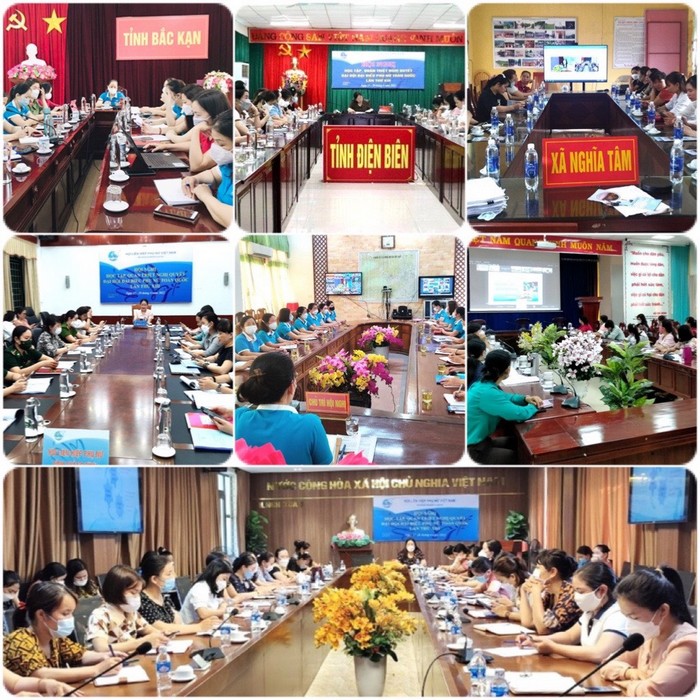 | Hội nghị tập huấn, quán triệt Nghị quyết Đại hội đại biểu phụ nữ toàn quốc lần thứ XIII lần đầu tiên được triển khai với quy mô lớn vừa trực tiếp và trực tuyến tại 4.053 điểm cầu; trong đó có 4 điểm cầu TW, 3 điểm cầu tỉnh, thành, 580 điểm cầu huyện, 3.406 điểm cầu xã. Tổng số đại biểu tham dự chương trình lên đến 62.132, trong đó TW là 363; Tỉnh/thành là 1.781; Huyện là 5.181; Chủ tịch Hội phụ nữ cơ sở là 9.045; Uỷ viên BCH Hội phụ nữ cơ sở và chi hội trưởng là 47.263. |