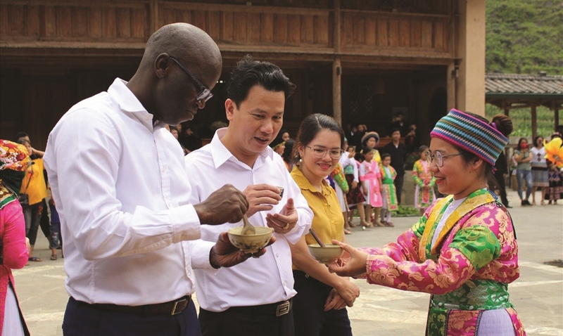 Sùng Mỹ Yên đón khách tới thăm quan Làng Văn hóa Du lịch cộng đồng dân tộc Mông huyện Mèo Vạc.