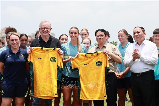Đại diện đội tuyển bóng đá nữ Việt Nam tặng chiếc áo thi đấu của đội tuyển Việt Nam cho Thủ tướng Phạm Minh Chính và Thủ tướng Australia Anthony Albanese. Trong chương trình thăm chính thức Việt Nam từ ngày 3 - 4/6, sau lễ đón chính thức, hội đàm và chủ trì họp báo chung, trưa 4/6, tại Hà Nội, Thủ tướng Australia Anthony Albanese cùng Thủ tướng Phạm Minh Chính đã tới thăm, giao lưu với Đội tuyển bóng đá nữ Australia và Việt Nam. Hai đội tuyển sẽ tham dự World Cup bóng đá nữ 2023 sắp diễn ra tại Australia và New Zealand.