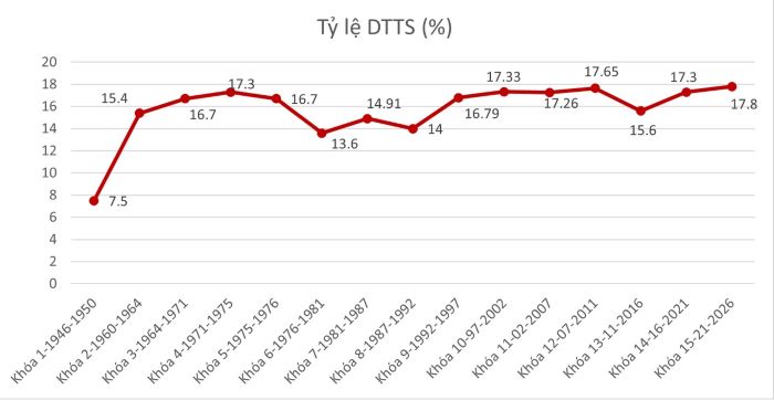 Tỷ lệ đại biểu Quốc hội dân tộc thiểu số từ khóa I đến khóa XV (%).