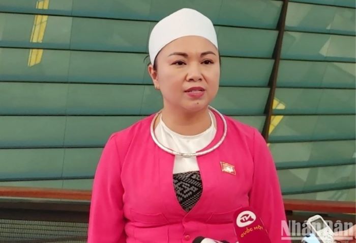 Đại biểu Quốc hội Đặng Bích Ngọc, người dân tộc Mường (Đoàn đại biểu Quốc hội tỉnh Hòa Bình), trả lời phỏng vấn báo chí bên hành lang Quốc hội. (Ảnh: TRUNG HƯNG)