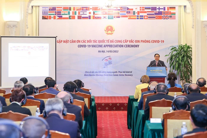 Thủ tướng Phạm Minh Chính phát biểu tại cuộc gặp mặt Cách đây gần 1 năm, ngày 1/4/2021, Việt Nam đã nhận được lô vaccine phòng COVID-19 đầu tiên với hơn 800.000 liều vaccine của COVAX - cơ chế chia sẻ vaccine toàn cầu. Kể từ đó, Việt Nam đã nhận được sự ủng hộ và chia sẻ vaccine của nhiều quốc gia và đối tác quốc tế, nhất là cơ chế COVAX, các nước đối tác quan trọng và bạn bè truyền thống. Bộ trưởng Bộ Ngoại giao Bùi Thanh Sơn khẳng định mọi sự hỗ trợ về vaccine của quốc tế đều được Chính phủ Việt Nam đưa đến người dân một cách kịp thời, an toàn và hiệu quả nhất.