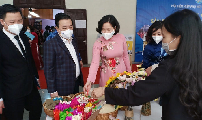 Phó Chủ tịch UBND Hà Nội, Trưởng ban vì sự tiến bộ phụ nữ thành phố Hà Nội Chử Xuân Dũng (thứ 2 từ trái qua), Chủ tịch Hội LHPN Hà Nội Lê Kim Anh (thứ 3 từ trái qua) thăm quan gian hàng của phụ nữ Thủ đô
