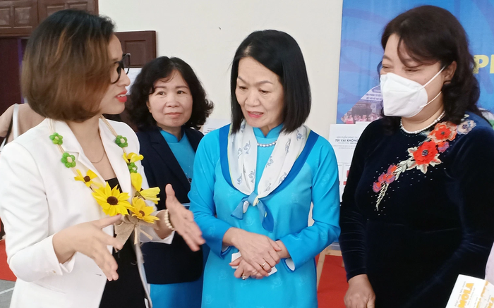 Phó Chủ tịch Hội LHPN Việt Nam Bùi Thị Hòa (giữa) thăm quan gian hàng của chị em phụ nữ Thủ đô với nhiều ý tưởng kinh doanh sáng tạo