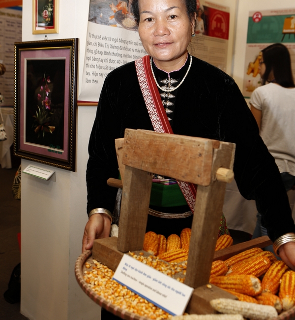 Nghệ nhân ưu tú Điêu Thị Xiêng với chiếc máy tẽ ngô tại Ngày Phụ nữ sáng tạo năm 2013