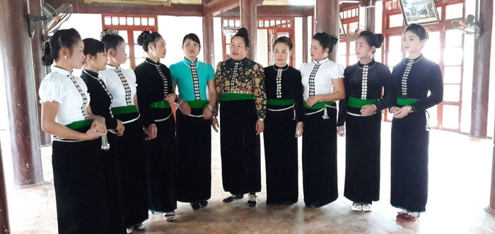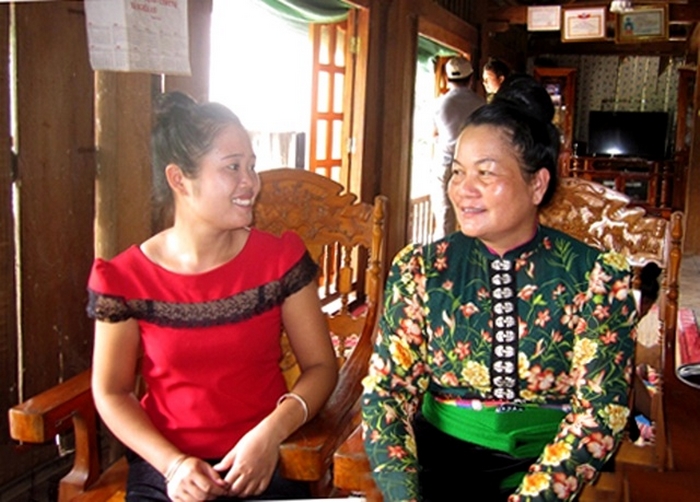 Nghệ nhân Điêu Thị Xiêng (phải) luôn gần gũi với phụ nữ để vận động chị em thực hiện nếp sống mới, giữ gìn bản sắc văn hóa dân tộc