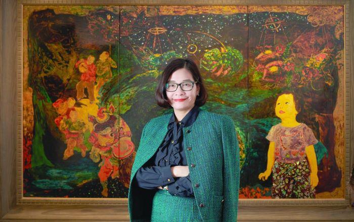 Chị Hoàng Mỹ Liên, sáng lập và điều hành Công ty Cổ phần Dịch vụ Thương mại & Đầu tư Nhật Nguyệt, chia sẻ về những ấp ủ khi ứng dụng hội họa Đông Dương trong thiết kế sản phẩm của mình. -