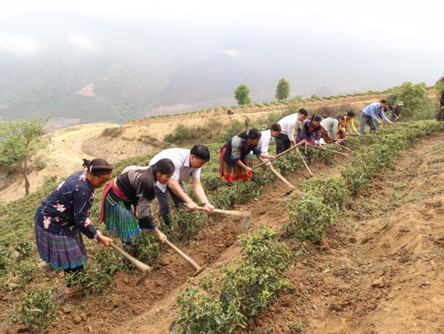 Người dân Tà Mung làm cỏ, chăm sóc chè