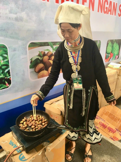 Chị Ngân rang hạt dẻ tại Hội chợ triển lãm các sản phẩm OCOP ở địa phương