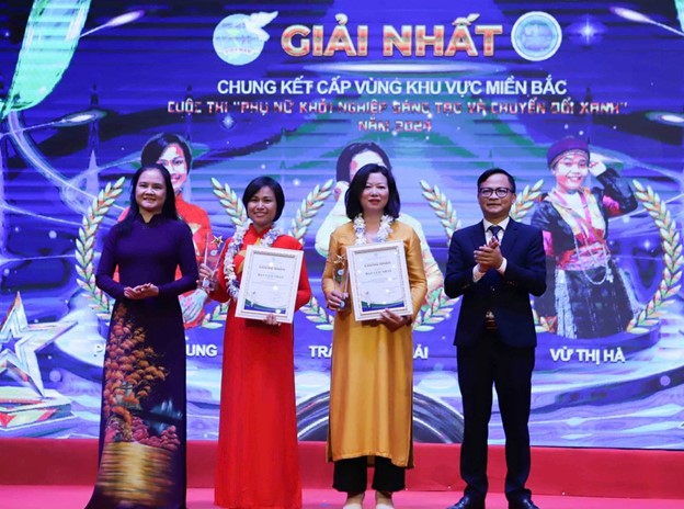 TS. Trần Lan Phương (trái), Phó Chủ tịch Hội LHPN Việt Nam - Trưởng ban Tổ chức Cuộc thi, trao giải Đặc biệt của vòng Chung kết Cuộc thi Phụ nữ khởi nghiệp khu vực miền Bắc năm 2024 cho Dự án chăn nuôi gà thảo dược vi sinh thả dưới tán hồi. Sự kiện Lễ trao giải Cuộc thi “Phụ nữ khởi nghiệp sáng tạo và chuyển đổi xanh” năm 2024 cấp Vùng khu vực miền Bắc nhằm vinh danh 37 Dự án khởi nghiệp xuất sắc vượt qua vòng loại chấm điểm rất khoa học, công minh của Ban Giám khảo - những chuyên gia hỗ trợ khởi nghiệp quốc gia giàu kinh nghiệm, chuyên môn sâu trên các lĩnh vực khoa học công nghệ, hỗ trợ khởi nghiệp đổi mới sáng tạo, nông nghiệp, đầu tư, chuyển giao công nghệ, thời trang. Trong đó, có 19 dự án được trao giải Khuyến khích, mỗi giải trị giá 4 triệu đồng; 8 dự án được trao giải Ba, mỗi giải trị giá 6 triệu đồng; 5 dự án được trao giải Nhì, mỗi giải trị giá 8 triệu đồng; 3 dự án được trao giải Nhất, mỗi giải trị giá 12 triệu đồng và 1 giải Đặc biệt trị giá 15 triệu đồng.