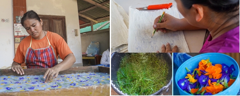 Với đôi tay khéo léo, họ sử dụng các loại hoa, lá tự nhiên vào giấy như một cách trang trí cho sản phẩm vừa đẹp vừa thân thiện với môi trường. Ngoài ra họ còn có thể trang trí giấy bằng cách thêm thuốc nhuộm vào bột giấy, in hoặc in hoa theo kiểu Batik.