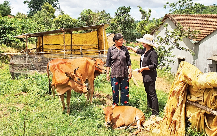 Cán bộ các cấp Hội Liên hiệp Phụ nữ xã Đăk Ui đến trò chuyện, hướng dẫn chị Y Bê cách chăn nuôi bò đúng cách. Chị Y Bê, làng Kon Tu, xã Đăk Ui, huyện Đăk Hà, vốn có hoàn cảnh hết sức khó khăn, nhưng đã mạnh dạn vay 50 triệu đồng từ Ngân hàng Chính sách xã hội để đầu tư mua ba con bò về chăn nuôi. "Được sự hướng dẫn của cán bộ Hội Phụ nữ xã, mình làm chuồng trại, chăm sóc bò tại nhà, tính toán từng khâu ăn, ở cho bò... Chỉ mong cho bò nhanh lớn, để bán bớt trả nợ và đầu tư nuôi, trồng cây để có thu nhập ổn định", chị Y Bê vui mừng cho biết.