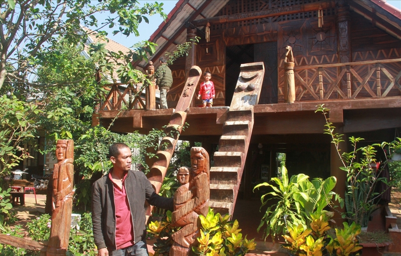 Bên trong homestay Hnoh Ea Kao trưng bày nhiều tượng gỗ dân gian