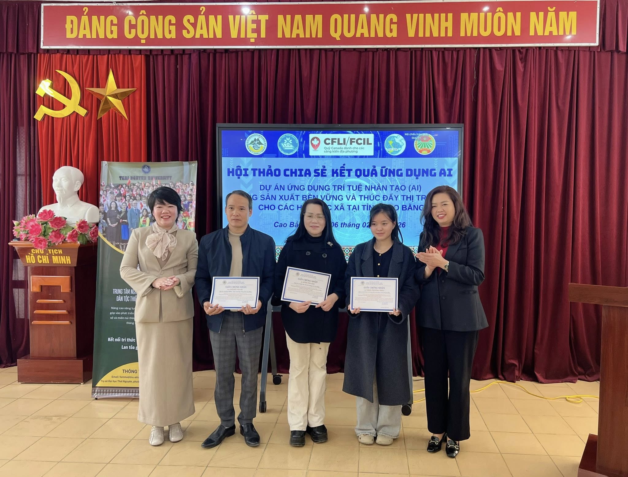 Đáng chú ý, Hội LHPN tỉnh phối hợp với Trung tâm Nghiên cứu Phát triển Phụ nữ Dân tộc thiểu số và miền núi (FEMMA) - Đại học Thái Nguyên triển khai Dự án “Ứng dụng trí tuệ nhân tạo (AI) trong sản xuất bền vững và thúc đẩy thị trường cho các hợp tác xã tại tỉnh Cao Bằng”. Dự án tổ chức các hoạt động tập huấn, cố vấn, hỗ trợ Hợp tác xã, đặc biệt là Hợp tác xã do phụ nữ dân tộc thiểu số tham gia quản lý; tổ chức hội thảo chia sẻ kết quả ứng dụng AI, xây dựng mạng lưới Hợp tác xã; đồng thời làm việc với đoàn công tác Đại sứ quán Canada nhằm trao đổi kết quả triển khai. Qua đó, các Hợp tác xã từng bước tiếp cận và ứng dụng AI trong sản xuất, quảng bá sản phẩm, quản lý đơn hàng, kết nối thị trường, góp phần nâng cao năng lực quản lý, thúc đẩy sản xuất bền vững và mở rộng cơ hội tiêu thụ sản phẩm.