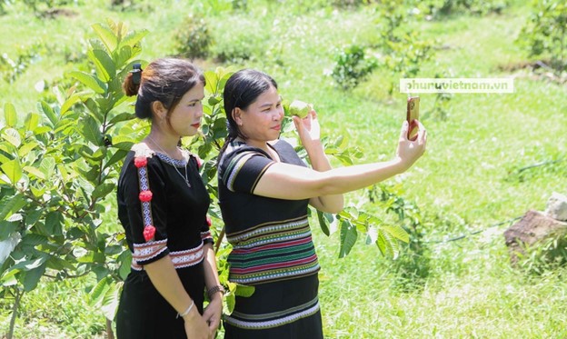 Chị em phụ nữ Ca Dong quay video để giới thiệu ổi rubi ruột đỏ ngay tại vườn