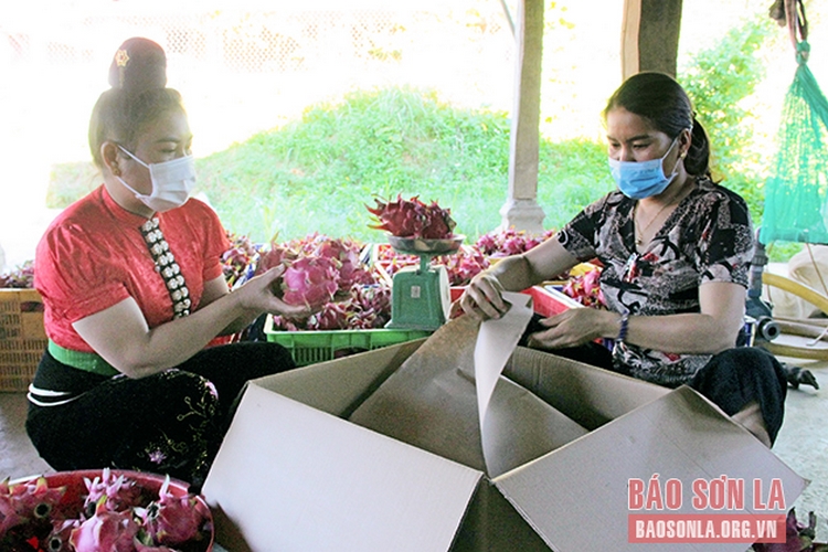 Chị Lò Thị Dưng (bên phải) cùng thành viên HTX Nông nghiệp Quỳnh Thuận, đóng gói  quả thanh long.