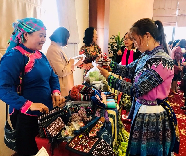 Chị Sùng Thị Lan (bên trái) giới thiệu sản phẩm tới khách hàng