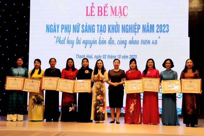 Lãnh đạo Hội LHPN và Hiệp hội doanh nhân nữ tỉnh trao bằng khen cho các đơn vị tham gia Ngày PNST năm 2023