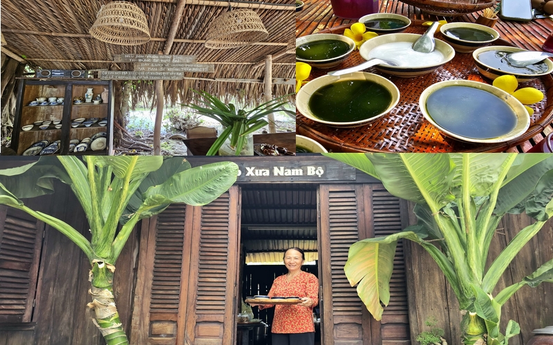 Bếp xưa đón du khách với mái lá, bếp củi, với đôi quang gánh và những đồ dùng, vật dụng đã ngả màu thời gian. Vừa giới thiệu không gian của bếp, cô Vân vừa mời du khách thưởng thức những món ngon do chính tay mình làm ra. Đó là chén sương sâm mát lạnh, là miếng mứt dừa ngọt ngào.