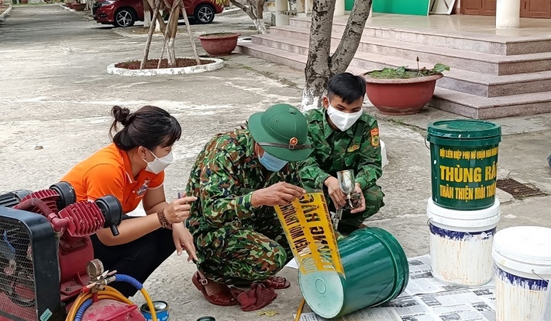 Với phương châm “Tận dụng-Tiết kiệm” cán bộ, hội viên phụ nữ quận phối hợp cùng cán bộ Đồn Biên Phòng Non Nước làm mới lại các thùng sơn tái chế thành thùng rác hộ gia đình để tặng cho hội viên, người dân