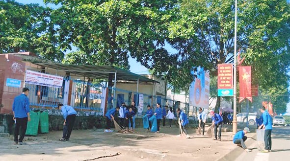 Các đoàn viên, thanh niên đoàn thị trấn Buôn Trấp dọn dẹp, thu gom rác thải trên tuyến đường của thị trấn.
