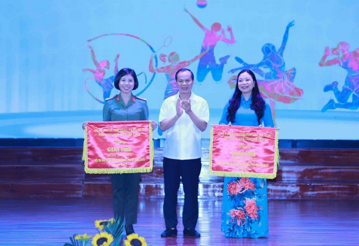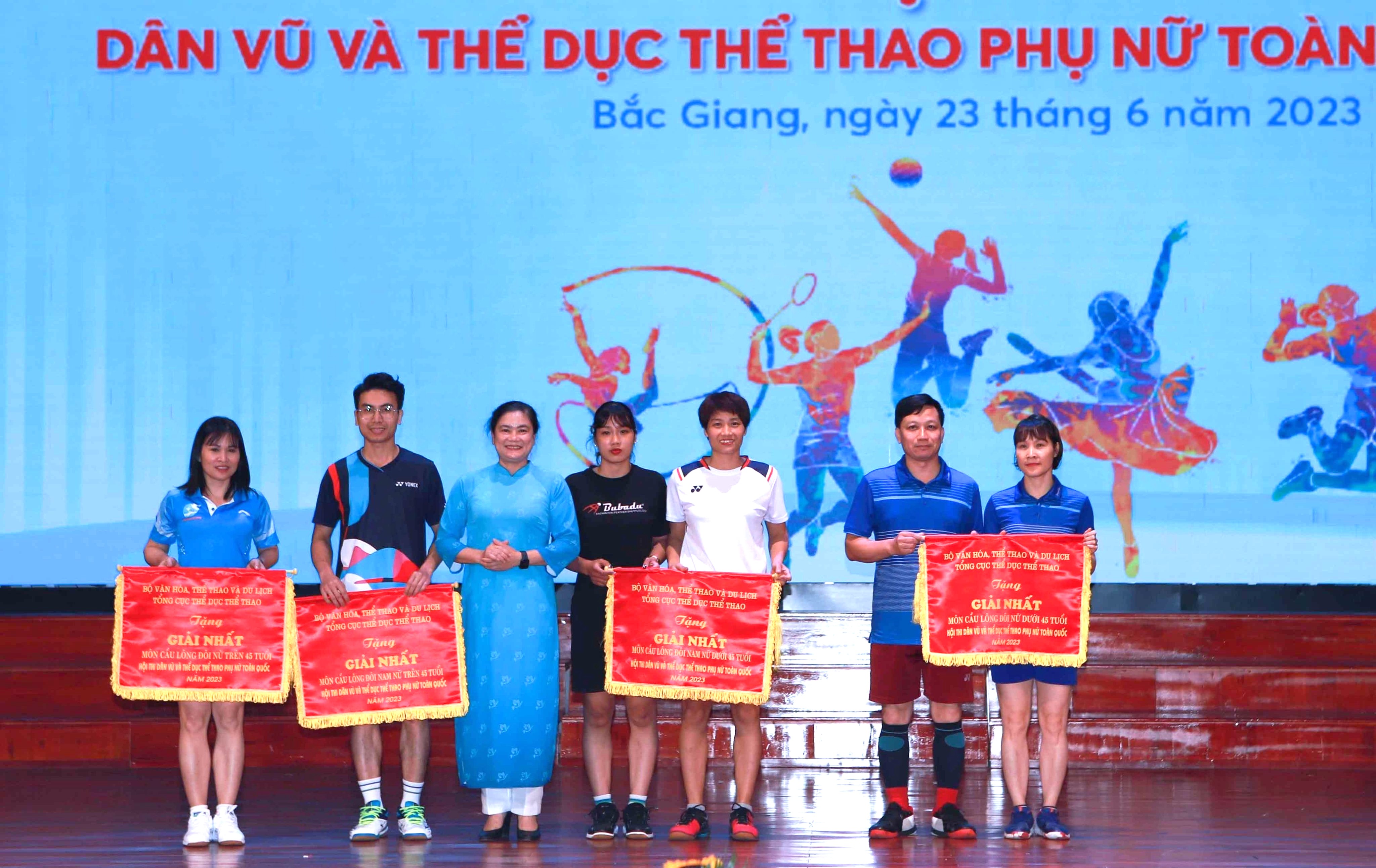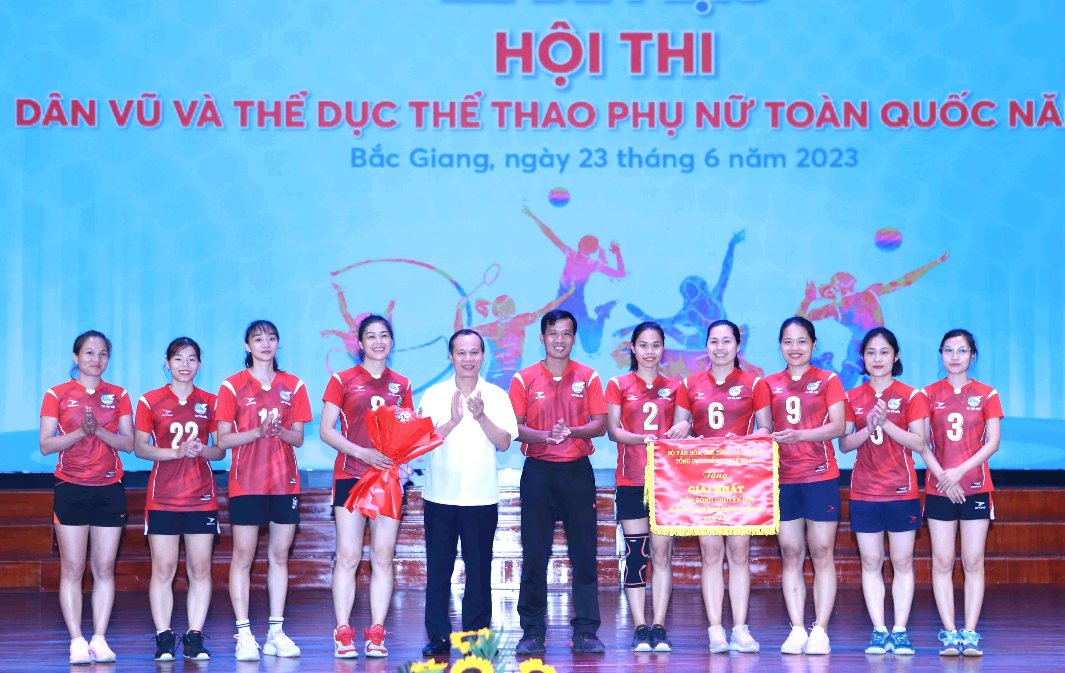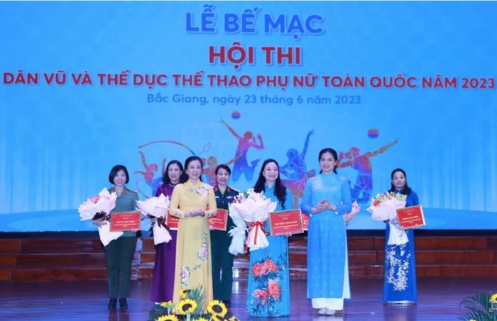 Ủy viên BCH TW Đảng, Chủ tịch Hội LHPN Việt Nam Hà Thị Nga và Phó Bí thư thường trực Tỉnh ủy, Chủ tịch HĐND tỉnh Bắc Giang Lê Thị Thu Hồng trao Giải Nhất môn Dân vũ cho Ban Phụ nữ Quân đội tại Hội thi dân vũ và thể dục thể thao năm 2023