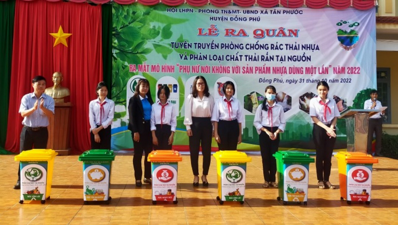 Tại buổi lễ, Hội LHPN huyện Đồng Phú đã thông qua Quyết định và ra mắt Mô hình  “Phụ nữ nói không với sản phẩm nhựa dùng một lần” và tặng giỏ nhựa cho 16 thành viên, tặng 6 thùng đựng rác cho trường TH và THCS Tân Phước