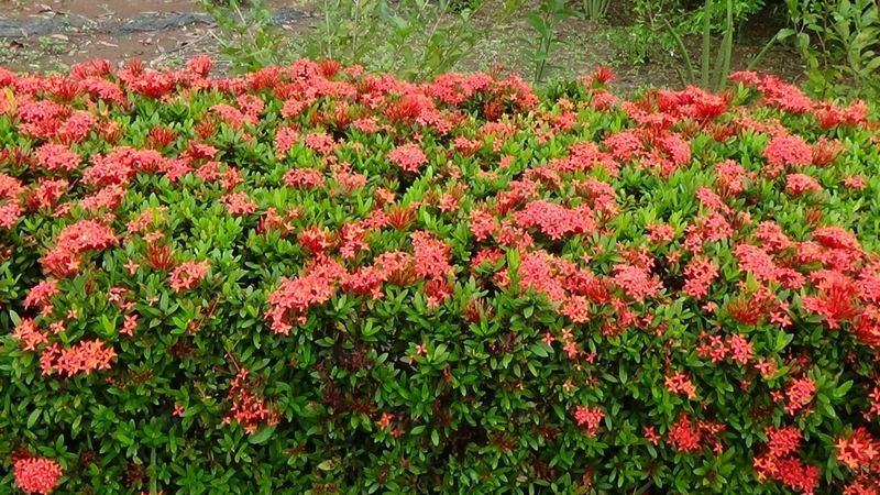 Hàng rào cây xanh của gia đình cô Mén vào mùa hoa nở luôn rực một màu hoa đỏ.