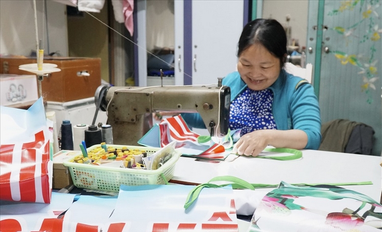 Bà Phạm Thị Nguyện có thêm một nguồn thu nhập từ những chiếc túi tái chế