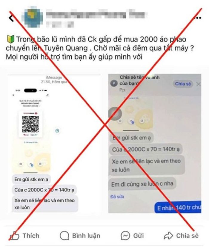 Các đối tượng lợi dụng việc kêu gọi quyên góp, ủng hộ người dân vùng bão, lũ để đưa ra các thông tin sai sự thật nhằm trục lợi. Hiện nay, những thông tin về tình hình mưa lũ tại miền Bắc đang nhận được nhiều sự quan tâm, chia sẻ trên mạng xã hội. Thế nhưng, bên cạnh những thông tin chính thống từ các cơ quan chức năng, xuất hiện tình trạng một số đối tượng lừa đảo, lợi dụng tình hình thiên tai đưa ra các thông tin sai sự thật. Những thông tin này không chỉ khiến người dân hoang mang, lo lắng mà còn ảnh hưởng nghiêm trọng đến công tác ứng phó và khắc phục hậu quả thiên tai...