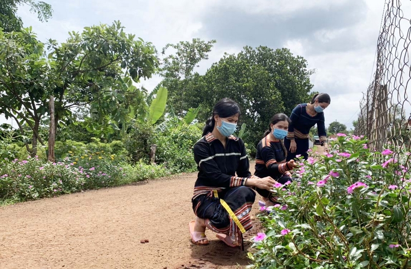 Không chỉ tuyên truyền hạn chế sử dụng túi ni lông, Hội LHPN xã Ia Mơ Nông còn vận động hội viên phụ nữ dọn vệ sinh, trồng con đường hoa để tạo cảnh quan xanh - sạch - đẹp.