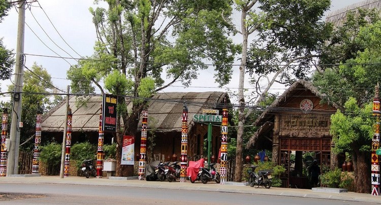 Vải thổ cẩm được “hiện thân” sơn cách điệu trên những cây cột trước nhà Rông du lịch
