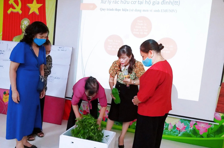 Chị Bùi Thị Thanh (thứ 2 từ phải sang) hướng dẫn hội viên cách ủ phân hữu cơ