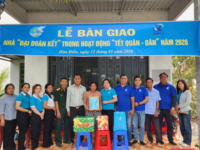 Bàn giao nhà Đại đoàn kết cho gia đÌnh chị Lê Thị Thúy Liễu, xã Hòa Điền Gia đình chị Lê Thị Thúy Liễu thuộc hộ khó khăn, gia đình có 5 khẩu, chồng là lao động chính, 3 con đang đi học, chị ở nhà chăm sóc gia đình. Gia đình chị phải sống trong ngôi nhà đã dột nát, xiêu vẹo, xuống cấp từ lâu. Để kịp thời giúp đỡ gia đình chị Liễu có một ngôi nhà kiên cố để che mưa, che nắng, vượt qua khó khăn, ổn định cuộc sống, Hội LHPN tỉnh đã vận động Công ty TNHH ROTO hỗ trợ kinh phí xây dựng căn nhà cho chị tại ấp Tân Điền, xã Hòa Điền. Sau gần 2 tháng thi công, ngôi nhà đã xây dựng hoàn thành với diện tích 72,5m2, mái lợp tole, cửa sắt, nền lót gạch.