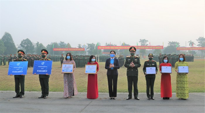 Đồng chí Hà Thị Nga, Thượng tướng Trần Quang Phương trao tặng “Tủ sách chiến sĩ” cho hai tiểu đoàn Phủ Thông, Bình Ca và các phần quà cho đại diện Hội Phụ nữ và trường mầm non xã Phú Cát, Phú Mãn.