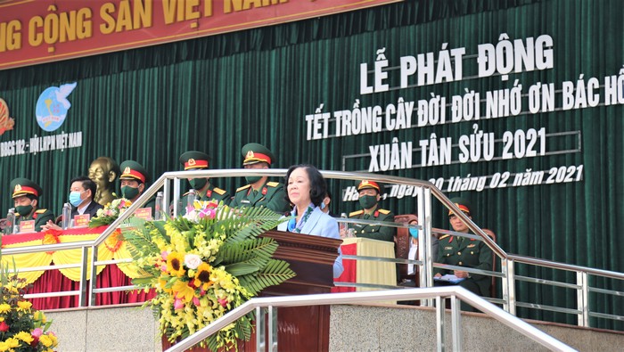 Phát biểu tại chương trình, đồng chí Trương Thị Mai - Ủy viên Bộ Chính trị, Trưởng Ban Dân vận TW mong muốn Hội LHPN Việt Nam tiếp tục phát huy tốt vai trò, vận động cán bộ, hội viên phụ nữ cả nước; đồng thời phối hợp với lực lượng vũ trang, các cơ quan, tổ chức vận động nhân dân nâng cao nhận thức, tích cực hưởng ứng phong trào trồng cây, bảo vệ rừng, môi trường sinh thái với tinh thần “người người trồng cây, nhà nhà trồng cây” góp phần cho đất nước tươi xanh.