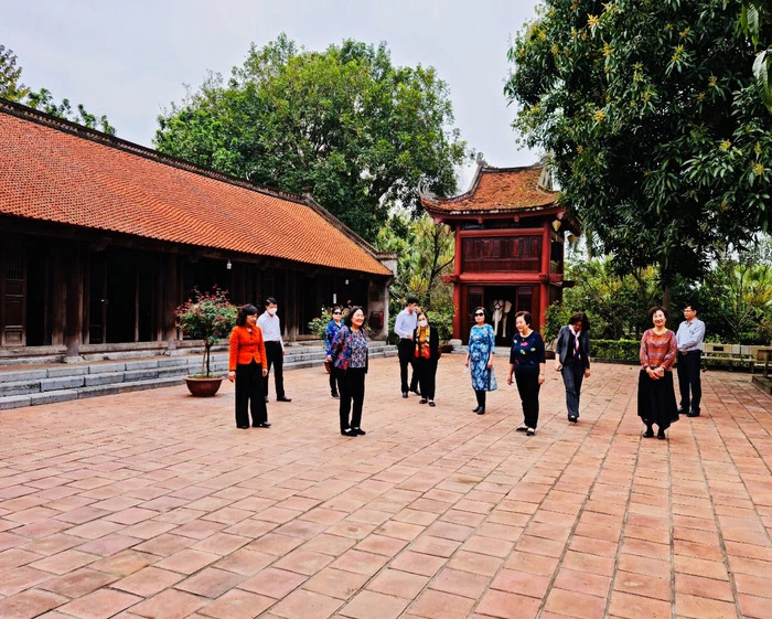 Lãnh đạo Hội Nữ trí thức Việt Nam, Lãnh đạo UBND huyện Mê Linh và Trưởng ban quản lý Đền kiểm tra, nghiệm thu khuôn viên Đền sau khi đã được phun xịt, xử lý rêu, trơn trượt