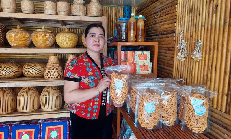 Bà Hoàng Thị Phượng, Phó Bí thư Đảng ủy xã Nghĩa An, thị xã Nghĩa Lộ, tỉnh Yên Bái, bên gian trưng bày những sản phẩm đặc trưng của địa phương tại Homestay
