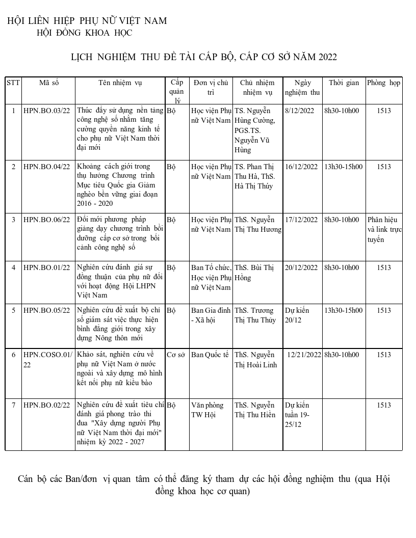 Lịch tổ chức các hội đồng nghiệm thu đề tài khoa học năm 2022 16/12/2022 Cổng TTĐT xin đăng tải Lịch tổ chức các hội đồng nghiệm thu đề tài khoa học năm 2022.