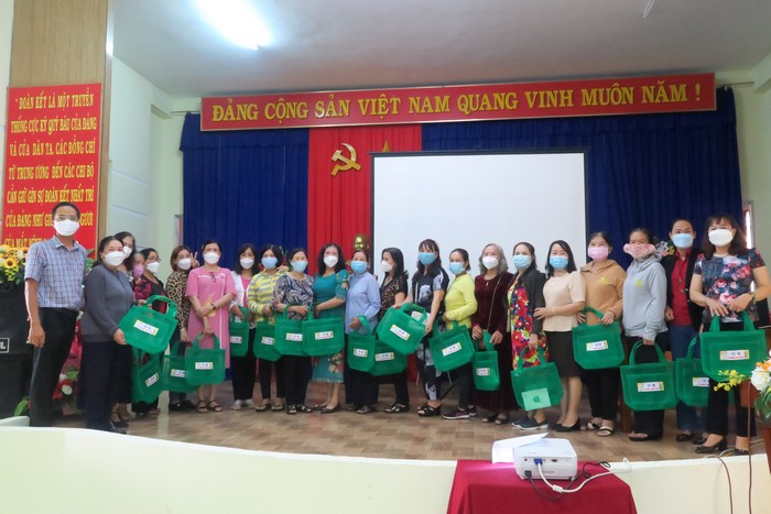 Đại diện Hội LHPN tỉnh và Tổ chức WWF tặng giỏ đi chợ cho hội viên phụ nữ trên địa bàn phường