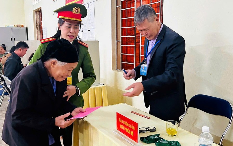 Nhiều điểm bầu cử ở vùng cao, xã Bế Văn Đàn, tỉnh Cao Bằng đi lại khó khăn, các nữ chiến sĩ Công an đã túc trực và sẵn sàng giúp đỡ người dân đến bầu cử.
