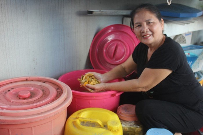 Các chị tận dụng rác thải gia đình (vỏ củ, quả), ủ thành nước rửa chén bát, góp phần lan tỏa mô hình sống xanh trong cộng đồng.