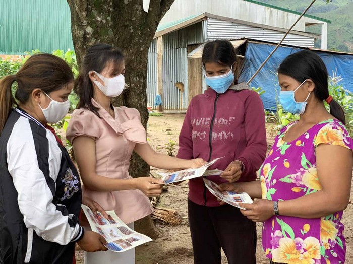Cán bộ Hội LHPN xã trao đổi với hội viên về nội dung tuyên truyền trên tờ rơi. Ảnh: Nhật Hào