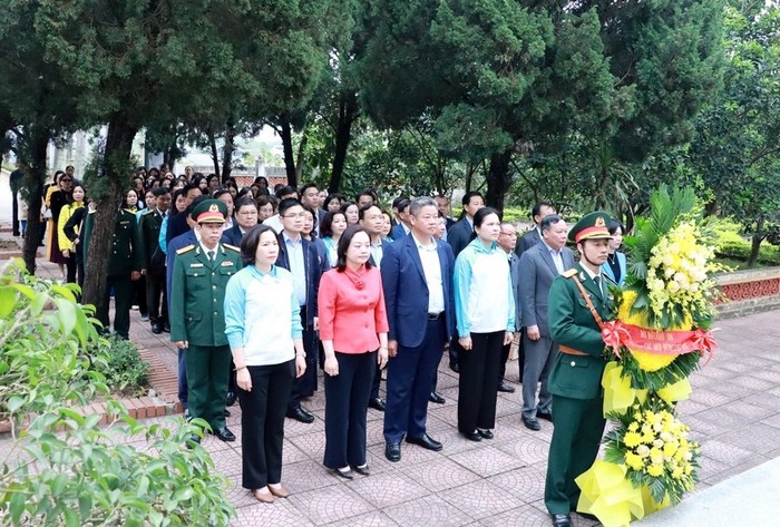 Các đại biểu dâng hương tại nghĩa trang liệt sĩ trong khu di tích lịch sử Khu Cháy, huyện Ứng Hòa