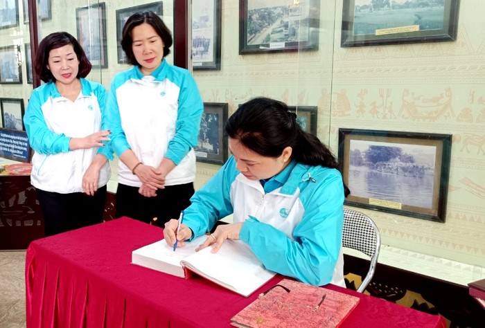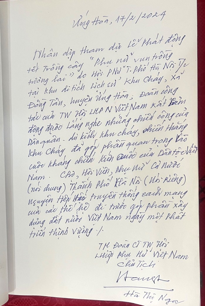 Ủy viên TƯ Đảng, Chủ tịch Hội LHPN Việt Nam Hà Thị Nga viết lưu bút tại Bảo tàng Khu Cháy