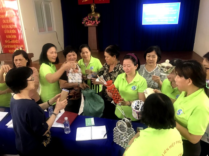 Bên cạnh đó, Hội đã tham gia các hội nghị để trưng bày giới thiệu sản phẩm và quảng cáo trên trang mạng xã hội… Ngoài ra, Hội còn tổ chức tập huấn hướng dẫn cách làm, tự do sáng tạo sản phẩm tái chế có tính ứng dụng cao mỗi quý 1 lần cho hơn 10 chị em phụ nữ và lực lượng nữ công nhân tại khu lưu trú, giúp chị em tạo ra các sản phẩm sử dụng trong gia đình, tiết kiệm được chi phí trong chi tiêu mua sắm sinh hoạt hàng ngày… Mô hình của Hội được công nhận là mô hình “Giải pháp sáng kiến xanh” đồng thời được khen thưởng thực hiện tốt phong trào thi đua “Dân vận khéo” năm 2020.