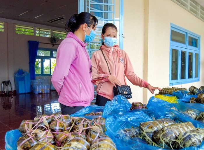 Những đòn bánh tét được chị em phụ nữ phường Trường An gói xuyên đêm để kịp chuyển đến bà con vào buổi sáng